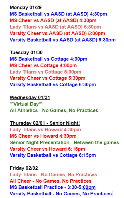 -Due to the number of games, Lady Titans Basketball will not have practices this week.