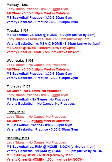 -The Middle School - Red Squad will Cheer for the full MS Boys game AND the 1st half of the Lady Titans Game on Tuesday, Nov 7th. MS Athletes should arrive at 3pm.