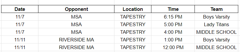 -Varsity will play in their 2nd game this Tuesday, Nov 7th. at HOME vs Mill Springs Academy at 6:15pm . Varsity Athletes should arrive no later than 4pm and support their fellow Titans! Please bring your temporary uniform!